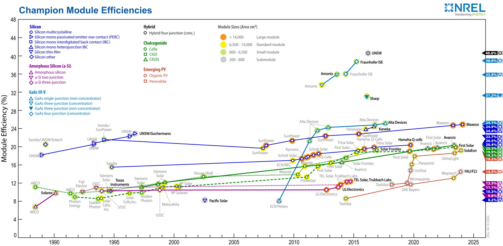 The solar industry has witnessed remarkable advancements in cell technology, leading to a surge in module wattage and efficiency. NREL (National Renewable Energy Laboratory) regularly updates the latest cell efficiencies as shown in the chart below. Do be advised cell to module efficiency almost always drop when manufacturer starts to begin commercialization due to inherent scale up losses between cells in a module.