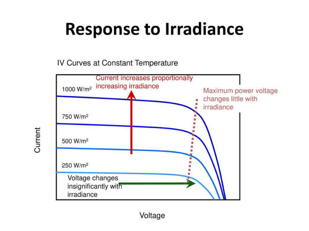 3. **Direct Correlation to Power Output**: Since power is the product of current and voltage, and current has a linear relationship with irradiance, we can more accurately estimate power output based on irradiance measurements.